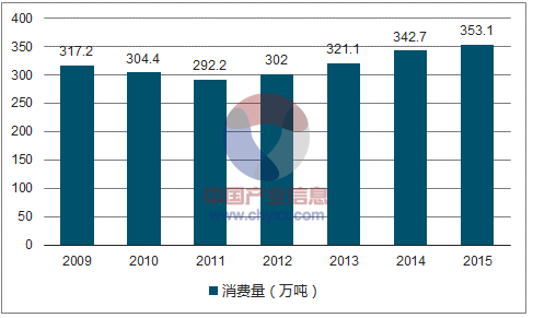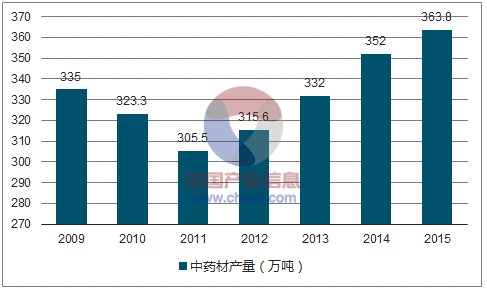 据统计,2014年我国中药材产量达到352万吨,产量较上年同期增长6.0%;消费量为349.7万吨,消费规模同比增长8.7%。2015年我国中药材产量约为363.8万吨,产量较上年同期增长3.35%;消费量为353.1万吨,消费规模同比增长3.03%。