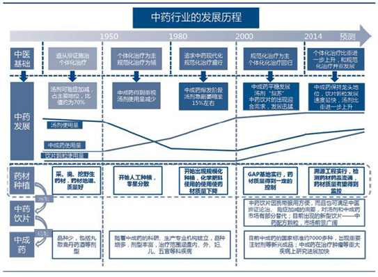 从50 年代开始,中成药以其便于携带、储存和规模化生产的优点得到重视,中药治疗逐渐演变为规范化治疗,至90 年代,中药行业追求中药现代化,中成药已经占据中药的鳌头,汤剂使用量萎缩至15%,中成药的规模化生产也推动药材实现人工规模种植。近年来,随着国家对“大健康”产业建设的支持和人们对个体化治疗的渴望愈加强烈,汤剂的使用量将进一步上升,对药材质量的要求也会提高。2014 年中药溯源工程开始推广和试行,药材的质量得到进一步的监控,这将促进中药行业的规范化发展。